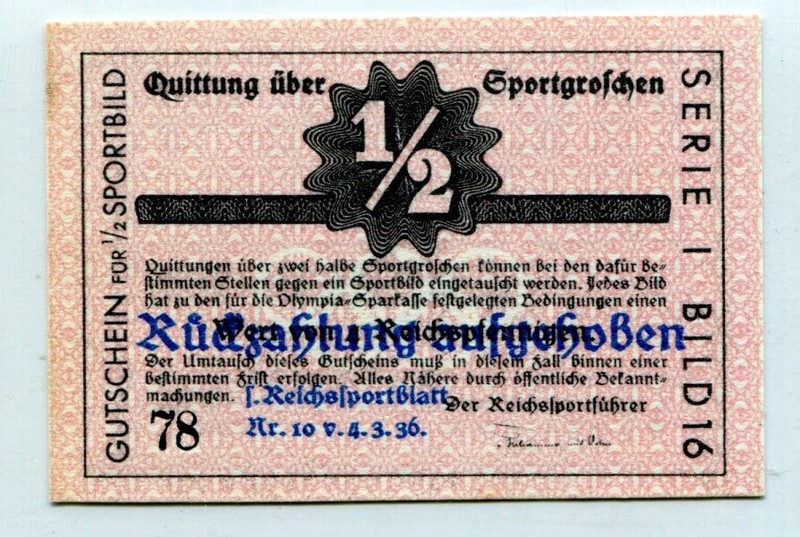 Germany 1936 Olympic Games 1 2 Sportgroschen Gutschein Overprint Aunc