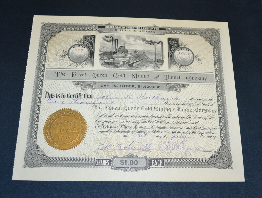 The Forest Queen Gold Mining and Tunnel Company 1904 Antique Stock Certificate