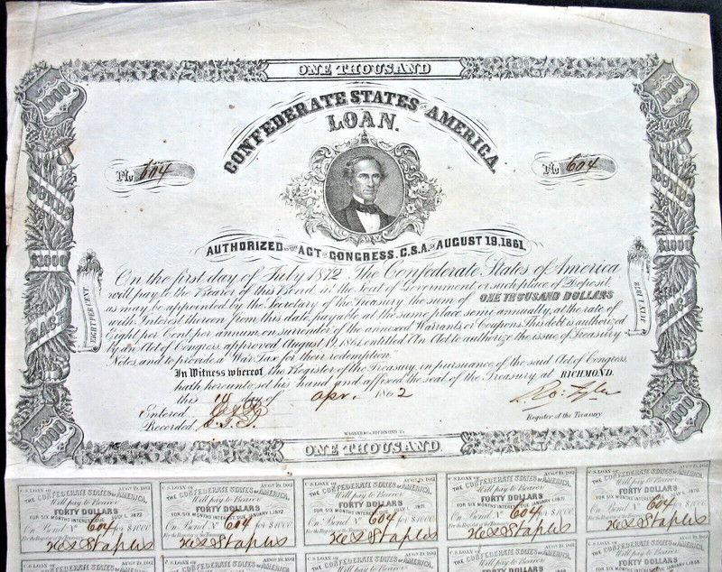 Last Confederate States of America Loan Richmond 1862 USA Memminger CSA Tyler