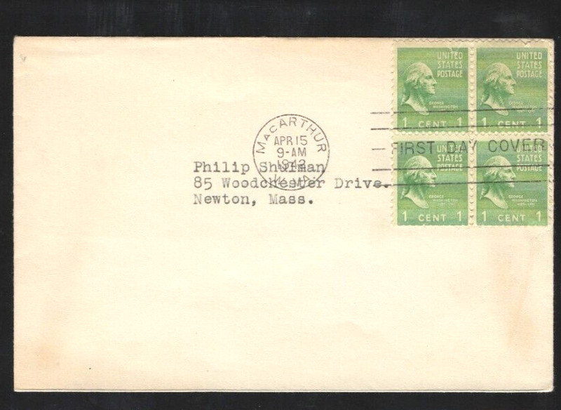 Apr 15 1942 Cover Macarthur WV First day Post Office, Block of 804, No Cachet