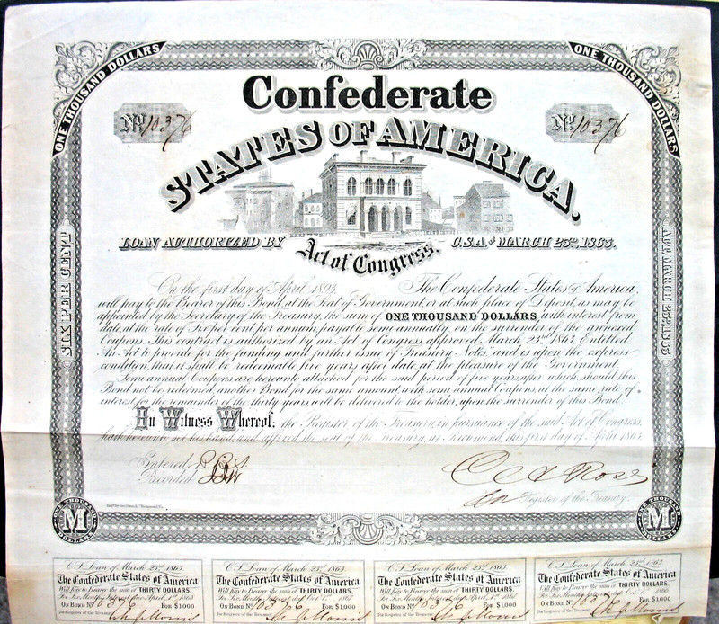 Confederate States of America Loan Cp Richmond 1863 USA CSA Customs House Rose