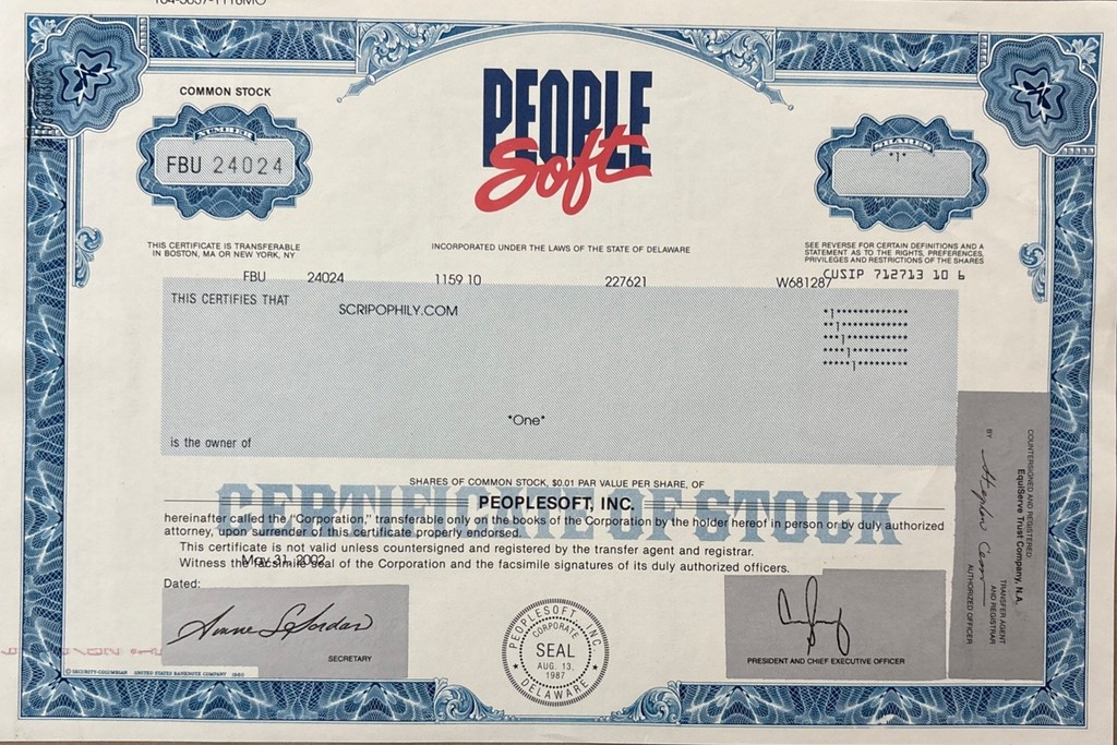 Peoplesoft Stock Certificate- Scarce VF- 1 Share