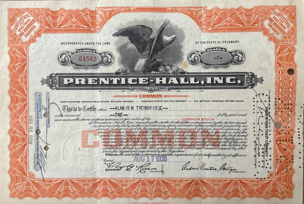 Prentiss Hall Stock Certificate- 1936 VF