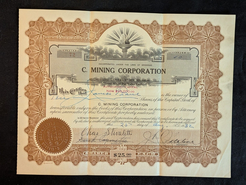 Mining Corporation Capital Stock Certificate 1931 10 Shares Cancelled Arkansas