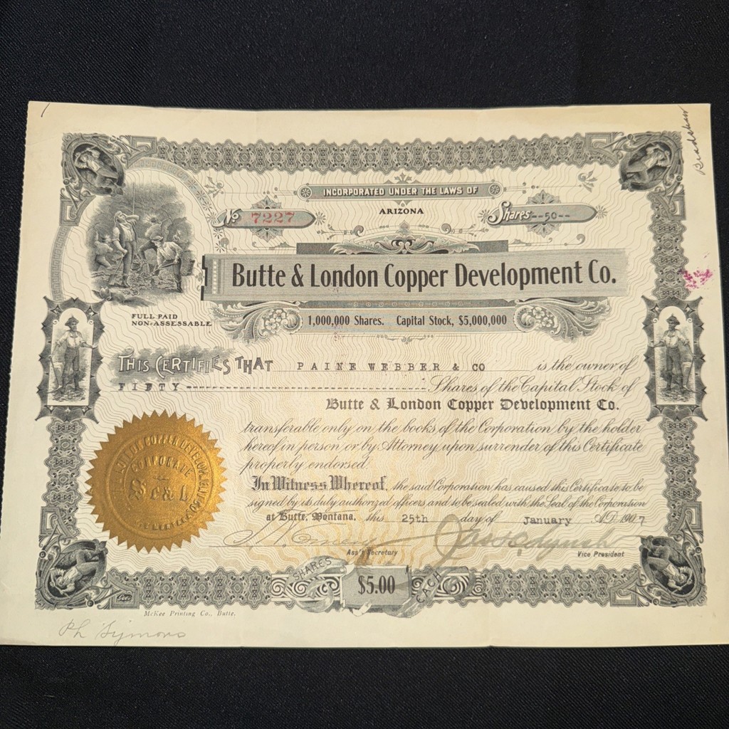 Lot of 8 Butte & London Copper Development Co. Stock Certificates 1907 1916