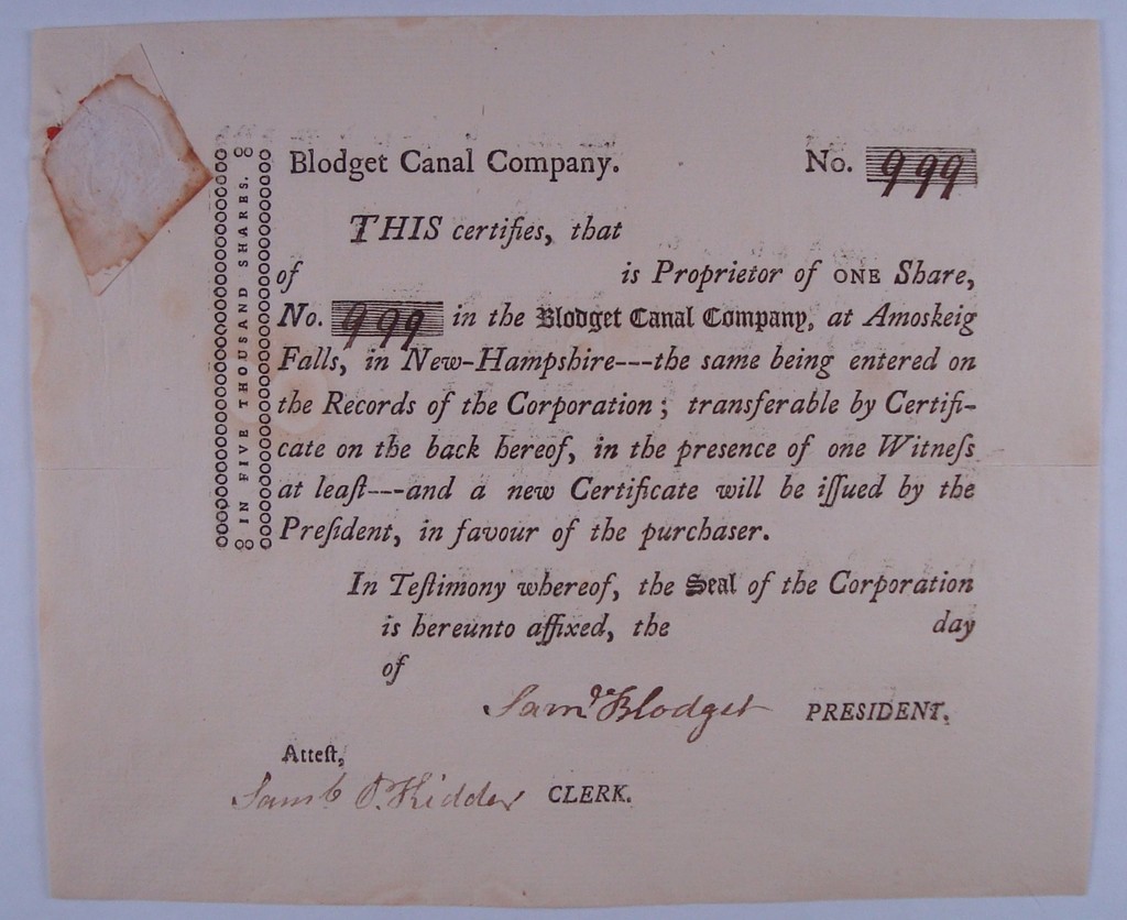 1799 Amoskeig Falls, NH (Manchester) Blodget Canal Company Stock Certificate