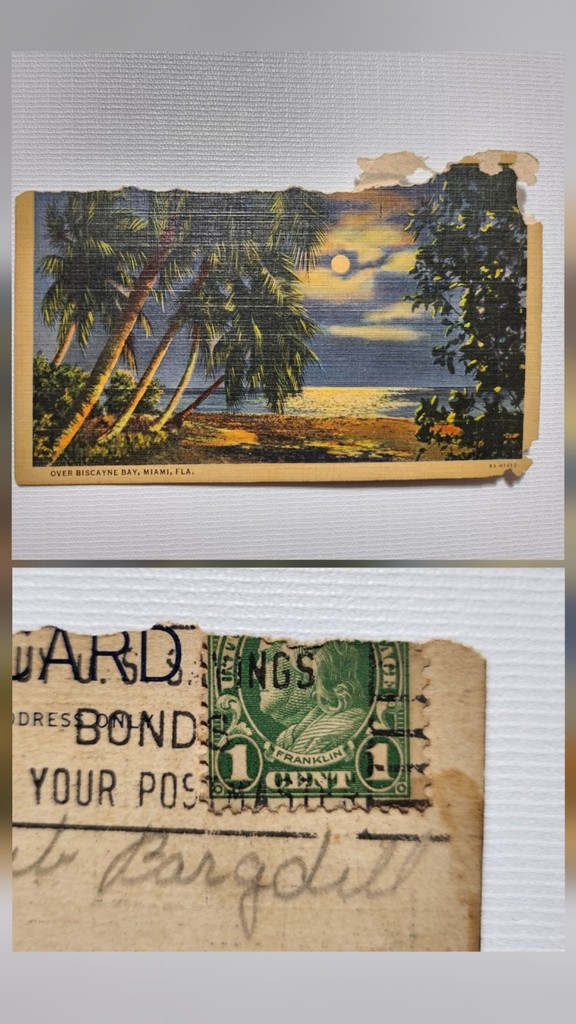 Old Vintage Postcard With Rare 1c Franklin Postage Stamp, . 1937 Miami Fl