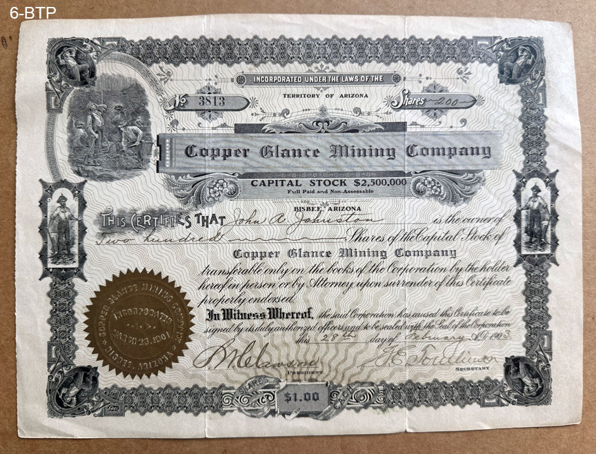 Very Rare 1903 Copper Glance Mining Company Stock Certificate Bisbee Arizona