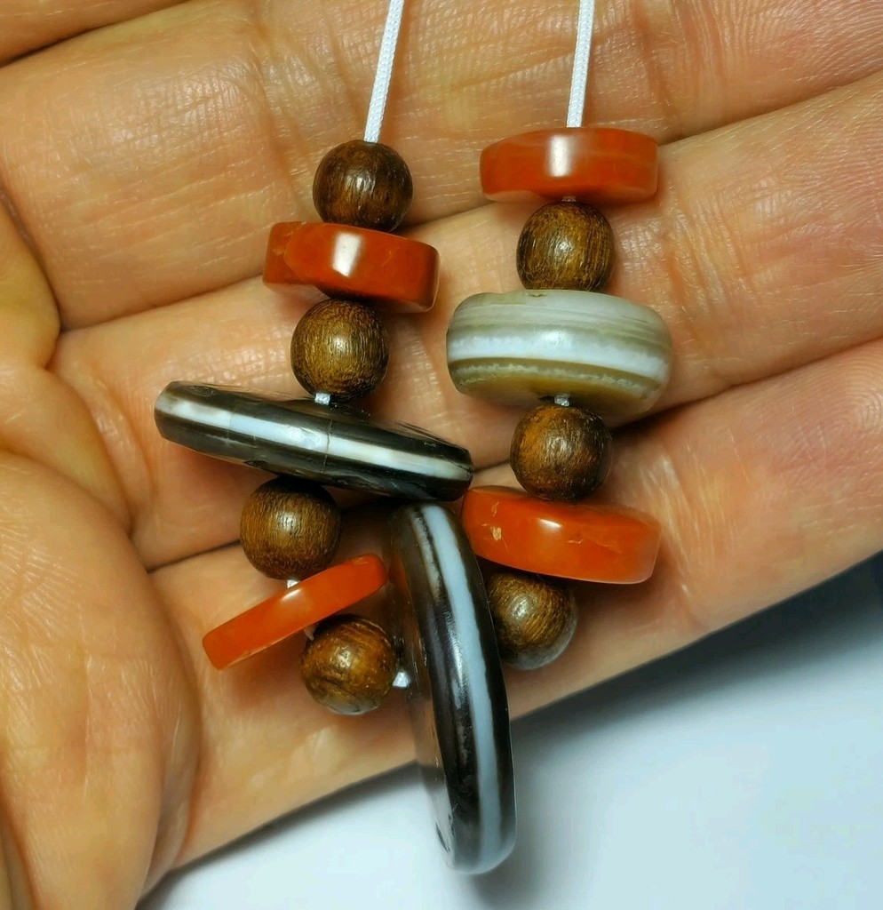 7 Ancient Indo Tibetan Chung Dzi Disc Agate & Antique Pema Raka Carnelian Beads