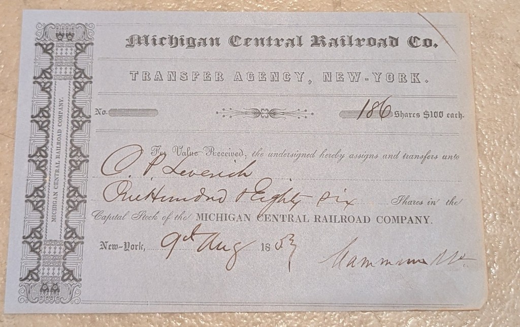 1853 Michigan Central Railroad Company NY 186 Shares Stock Bond Transfer Order!